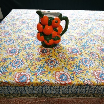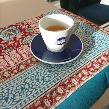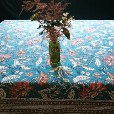 Comme nous vous adorez l'Inde, ses tissus, ses traditions, et vous auriez aimé être de notre dernier voyage à la recherche des plus belles indiennes à vous faire découvrir ! Alors, comme un accessoire souvenir qui vous transportera par l'esprit dans ce pays mystérieux, nous vous proposons quelques pièces déjà confectionnées pour vous par les artisans indiens qui créent nos indiennes, comme cette grande nappe à motifs de fleurs bleues et roses sur fond bleu ciel et cernée d'une jolie frise rose.
